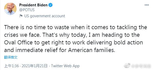 当地时间1月20日,拜登在首都华盛顿宣誓就任美国第46任总统后,用@POTUS 账号发布的第一条推特称:在解决我们面临的危机时,没有时间可以