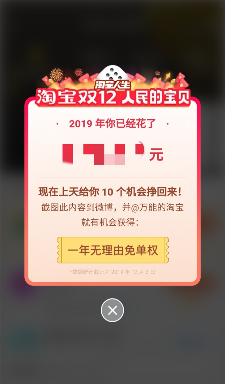 2019淘宝年度账单已经出炉,打开淘宝搜索你绝对不想知道的事,首页跳出的就是2019年你已经花了多少钱,数据统计的是从今年年初到12月3日在