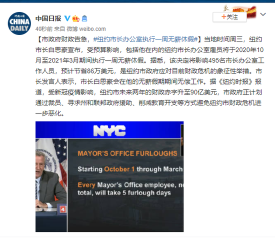 当地时间周三,纽约市长白思豪宣布,受预算影响,包括他在内的纽约市长办公室雇员将于2020年10月至2021年3月期间执行一周无薪休假。据悉,