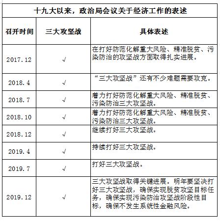 一方面,2019年12月6日召开的政治局会议定性:经过2年多努力,“三大攻坚战取得关键进展“。