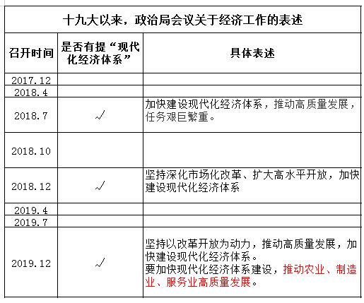 值得注意的是,在2019年12月6日召开的政治局会议上,虽然通篇报道不过1600字,但却两次提到要“加快建设现代化经济体系”。且与以往着重强调制造业不同的是,此次会议还提到了农业和服务业,强调要“推动农业、制造业、服务业高质量发展”。